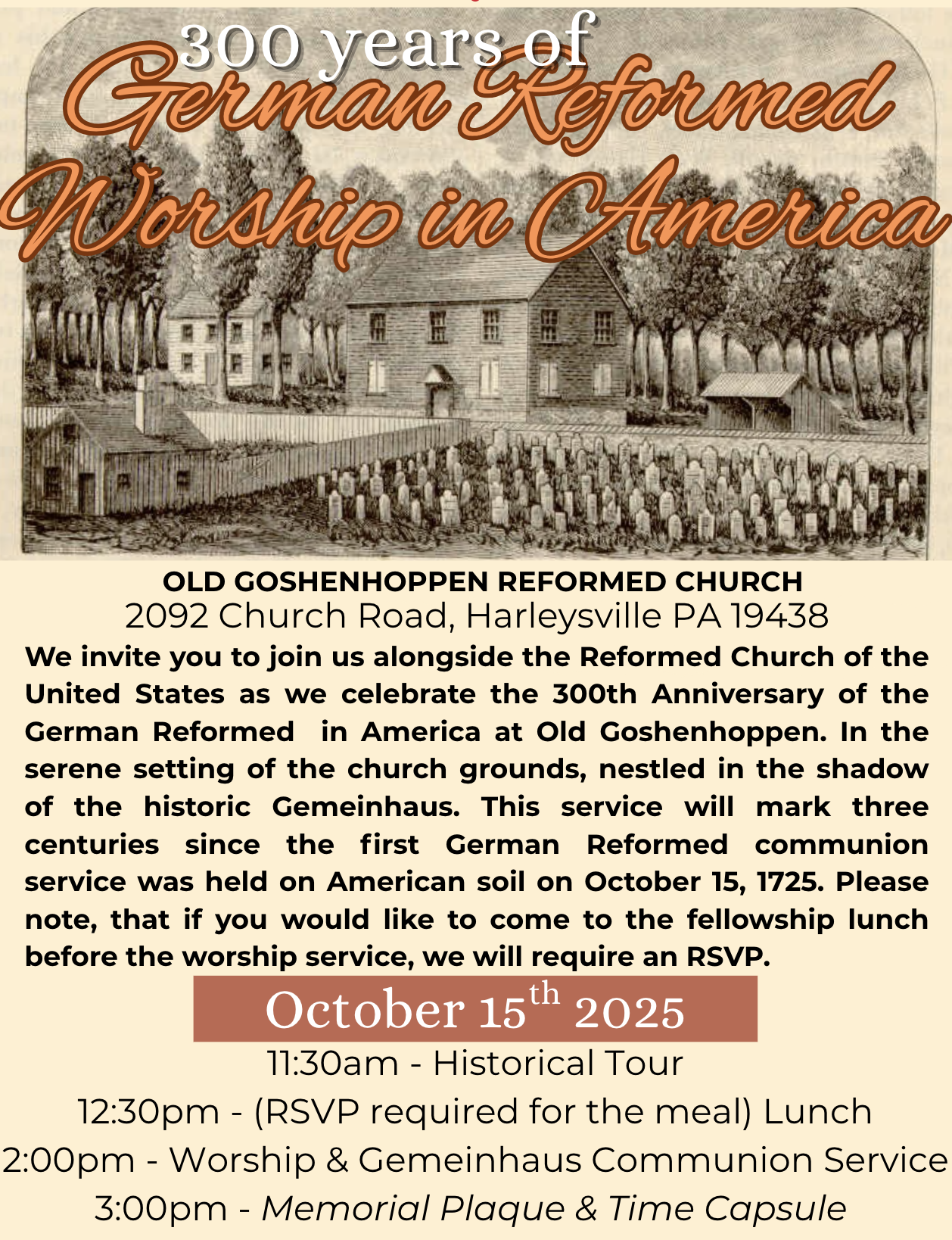 300th Anniversary of the German Reformed in America, a worship service at Old Goshenhoppen Reformed Church – Join us on October 15, 2025, at 2:00 PM for a special outdoor worship service (weather permitting) in the shadow of the Gemeinhaus at Old Goshenhoppen Reformed Church, the oldest standing German Reformed church in North America. This service commemorates the 300th anniversary of the first German Reformed communion service on the North American continent on October 15th 1725. We will honor this historic milestone with worship and fellowship, culminating in a communion service inside the Gemeinhaus. The event will be held at Old Goshenhoppen Reformed Church, 2092 Church Road, Harleysville, PA 19438. In the event of inclement weather, the entire service will take place in the church sanctuary. All are welcome, after the service there will be the burial of a timecapsule for the 400th year (Lord willing, and if He tarries).